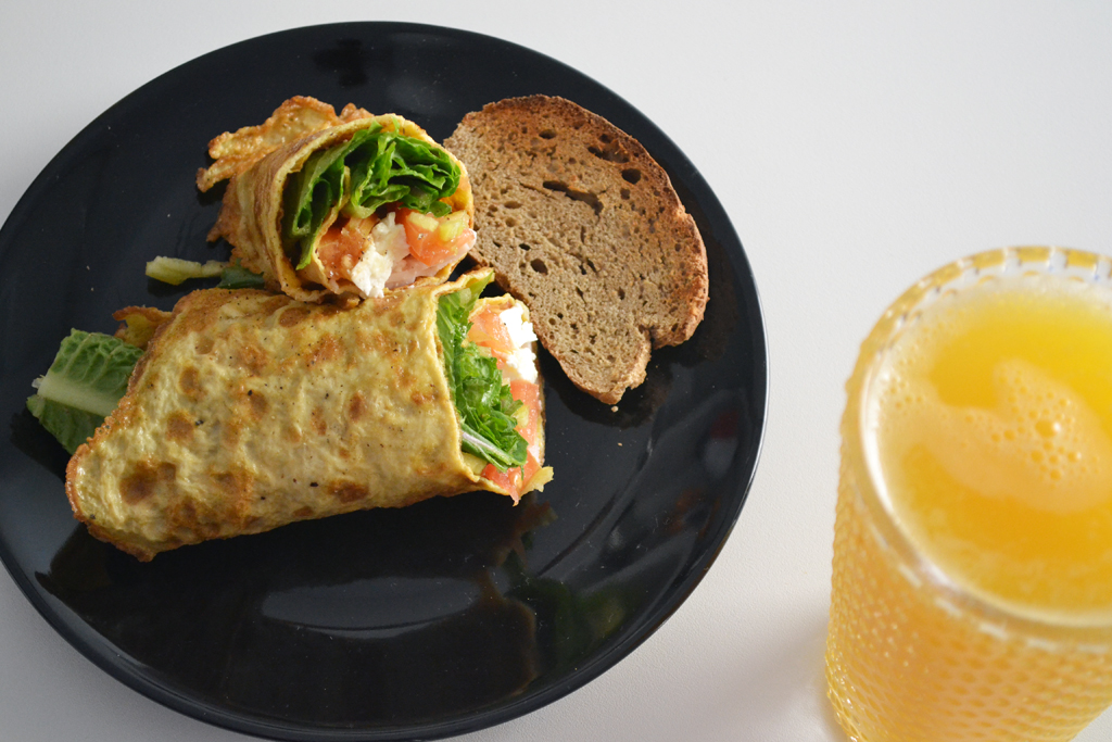 It’s a simple omelet cooked really thin and filled with feta cheese, turkey, tomato and lettuce or whatever ingredient you like. I used one egg per person for the omelet in the photo. My advice is to have all your other ingredients ready, because the omelet cools really quickly.