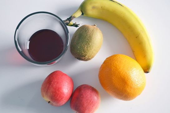 Μια μπανάνα, ένα ακτινίδιο, ένα πορτοκάλι και δύο μικρά μήλα καθαρισμένα και κομμένα σε χοντρά κομμάτια μέσα στο blender με λίγο χυμό για να μπορέσουν να χτυπηθούν (εγώ είχα λίγο φυσικό χυμό ρόδι) και έχετε 2 μεγάλα ποτήρια από φρέσκο και χορταστικό χυμό φρούτων!