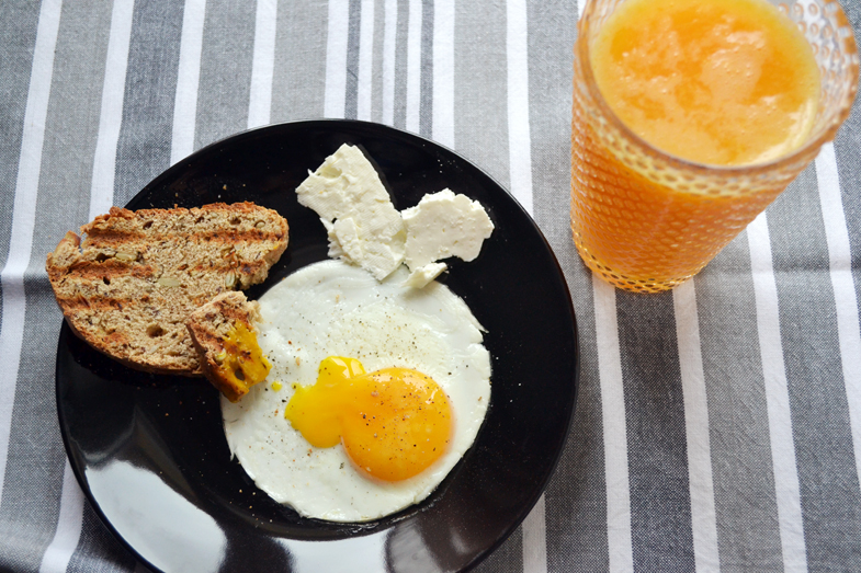 Πολύ πρόσφατα πληροφορήθηκα για το σωστό τρόπο μαγειρέματος του τηγανητού αυγού. Σε χαμηλή φωτιά (το μάτι της κουζίνας μου, που φτάνει μέχρι το 12, το έβαλα στο 4) σε ένα αντικολλητικό τηγάνι έβαλα ελάχιστο λάδι, έσπασα το αυγό και το άφησα να μαγειρευτεί για 10 λεπτά περίπου. Έτσι μαγειρεύτηκε το ασπράδι χωρίς να καεί και ο κρόκος έμεινε υγρός χωρίς να είναι άψητος. Με μια μικρή φέτα πολύσπορο ψωμί, λίγο τυρί και φυσικό χυμό πορτοκάλι έγινε πλήρες το γεύμα.