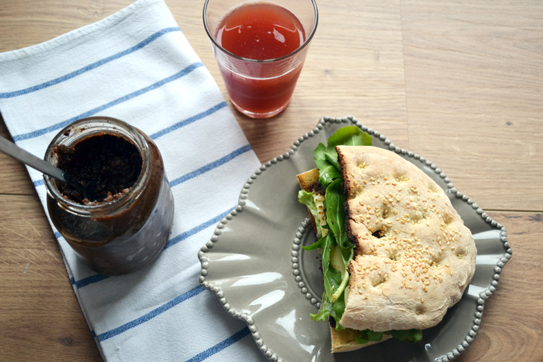 Αυτό είναι το πρωινό μου σχεδόν καθημερινά από τότε που έφτιαξα τις λαγάνες μέχρι να τελειώσουν! Η λαγάνα κομμένη στη μέση και φρυγανισμένη με μια φέτα κίτρινο τυρί, λίγο μαρούλι, λίγη ρόκα και σπιτικό πατέ ελιάς! Τόσο νόστιμο που θα μπορούσα να τρώω μόνο αυτό όλη μέρα! Εδώ το συνόδεψα με έναν δροσερό χυμό ρόδι.