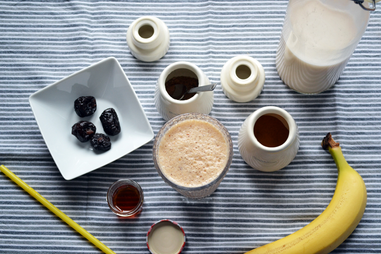Η σημερινή πρόταση είναι ένα ιδιαίτερο σε γεύση smoothie. Χρησιμοποίησα γάλα αμυγδάλου (τη συνταγή θα βρείτε εδώ), το συνδύασα με κάποια μπαχαρικά και φρούτα που θεώρησα ότι ταιριάζουν με τη γεύση του και χτύπησα όλα τα υλικά στο blender. Για δύο ποτήρια χρειάστηκα