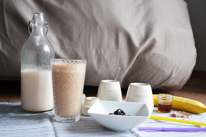 Today’s suggestion is an interestingly flavored smoothie. I used almond milk (you can find the recipe here), i combined it with spices and fruit i thought go well with its taste and blended everything together. For 2 glasses i needed