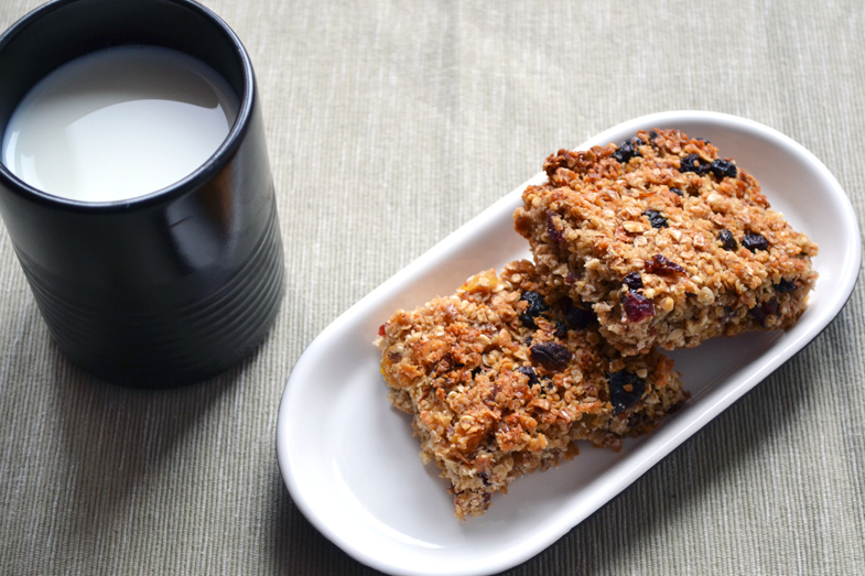 On a sheet pan toss the oats, almonds and coconut and bake for 10-12 minutes at 180 degrees until lightly browned. Transfer the mixture in a mixing bowl and while hot, stir in the honey, vanilla and salt, mix well and add the dried fruit. Butter a rectangle baking dish (mine was 20×25 cm) and line it with parchment paper. Pour the mixture in and press really well until it is tightly packed. Bake for 25-30 minutes until lightly golden brown and wait 2-3 hours before cutting into squares (you will need a sharp knife to do this). Store the bars in the fridge for about a week or a week and a half and use parchment paper between the pieces to prevent them from sticking. I found that their flavor was even better after the first day in the fridge.