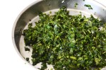 During this time prepare the filling. You can use any wild greens you like, such as wild poppies, nettles, chards, endives. Wash your greens really well and cut them in small pieces. Use the salt to rub your greens with your hands. This is a little trick that helps them keep all their freshness and flavors without having to saute them. Add the rest of the ingredients apart from the cheese and mix well.