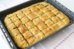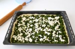 Roll out the two doughs you kept in the fridge. Place the first rolled dough in an oiled pan, add the filling, then the cheese and top it with the second rolled dough. Oil the pie, cut it and bake it approximately for an hour at 170 degrees. Good luck!