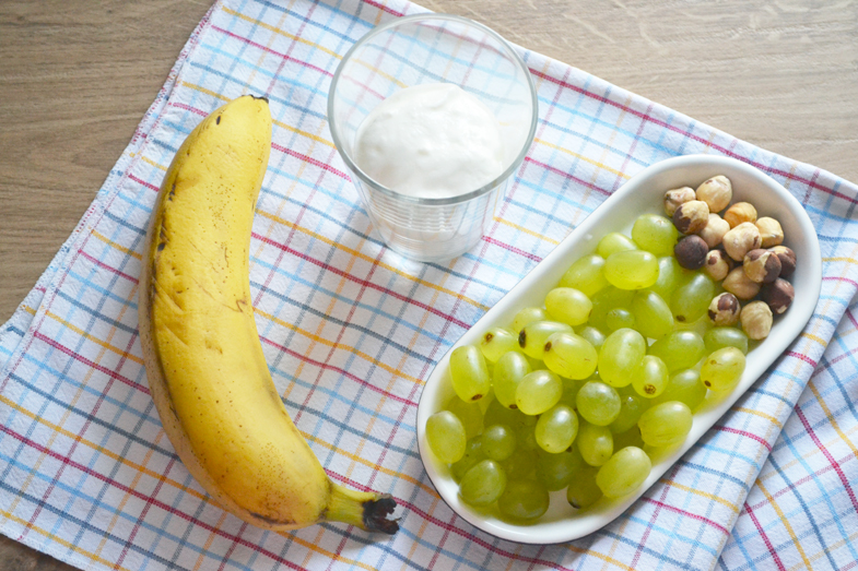 Another fruity breakfast, a smoothie with grapes, a banana, yogurt (200gr) and some hazelnuts i had. Instead of the hazelnuts you could also use walnuts, they taste great with grapes!