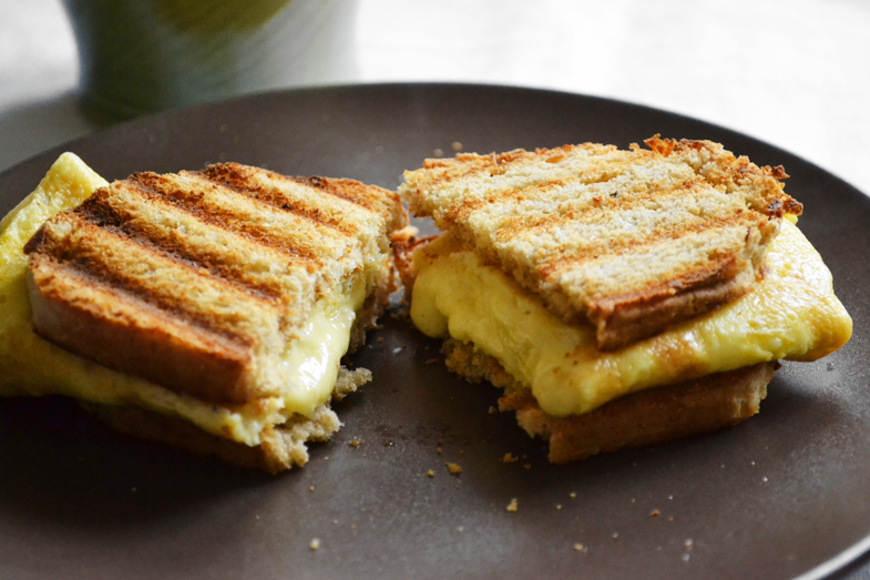 Begin by toasting your bread. Heat a non-stick pan on medium heat and add the butter or oil. In a bowl beat the egg, water, salt and pepper with a fork. Pour the egg in the pan and roll it around to cover it. The egg will be like a very thin omelet. Immediately put the cheese in the middle. Cook the egg for 1-2 minutes and use a spatula to start folding it into the shape that’s suitable for your bread. Assemble the sandwich and eat while it is still warm.