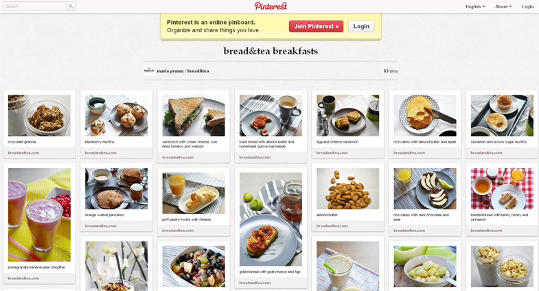 Αυτή είναι η σελίδα του blog sto Pinterest ! Αν έχετε κι εσείς λογαριασμό στο pinterest, μπορείτε να ανεβάσετε τα πρωινά του bread&tea που σας αρέσουν πατώντας το κουμπί Pin it κάτω από κάθε post. Προς το παρόν έχω κάνει ένα board με τα πρωινά μου, αλλά ετοιμάζω και άλλα με ενδιαφέροντα links!