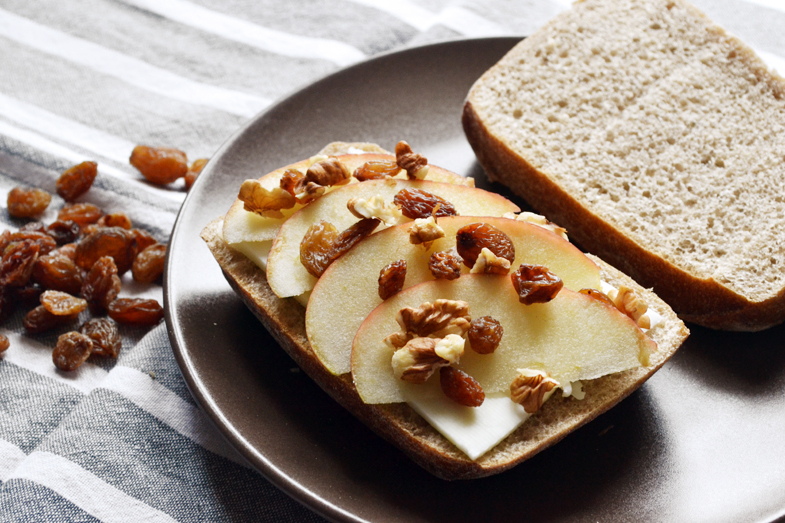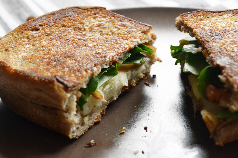 … και ένας διαφορετικός τρόπος ψησίματος. Διάλεξα μια γραβιέρα με έντονη, λίγο πικάντικη γεύση. Αντί να κόψω μια φέτα γραβιέρας, έκοψα 3-4 λεπτές για να λιώσουν πιο εύκολα. Πρόσθεσα λεπτές φέτες μήλου, σταφίδες και λίγα καρύδια και σε ένα αντικολλητικό τηγάνι σε μέτρια φωτιά έβαλα λίγο βούτυρο και έψησα το σάντουιτς μέχρι να ροδίσει και από τις δύο πλευρές. Με αυτόν τον τρόπο το τυρί έλιωσε και το ψωμί μαλάκωσε, αλλά έκανε μια ωραία τραγανή κρούστα. Αν θέλετε, όμως, να αποφύγετε το τηγάνι και το βούτυρο, μπορείτε να χρησιμοποιήσετε και τοστιέρα. Στο τέλος πρόσθεσα και λίγη ρόκα, που μπαίνει σε όλα μου τα σάντουιτς τελευταία!