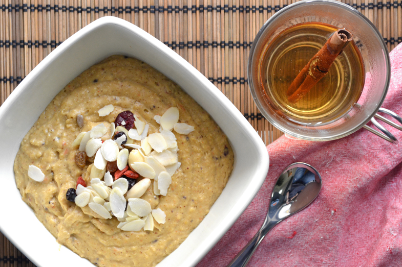Prepare the tea. Put oats, honey, almond butter and the antioxidants mix in a food processor. Add as much tea needed just to cover everything. Mix really well and add, if you wish, more tea to get the desired consistency of the creme. Serve with nuts or dried fruit and a cup of your tea.