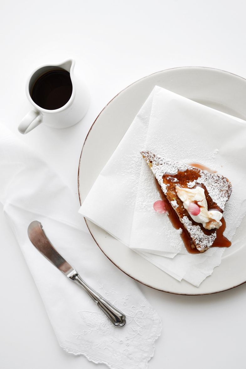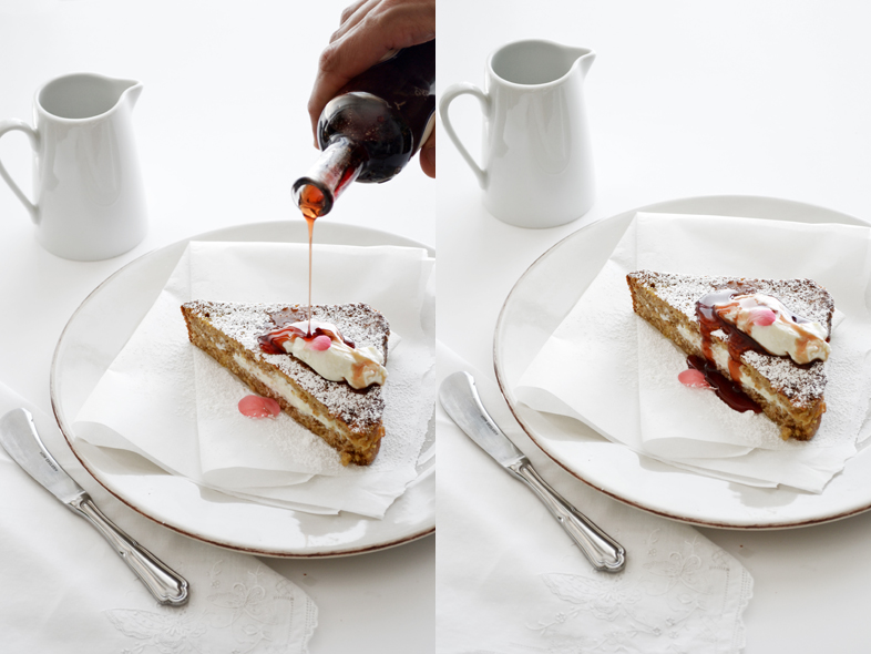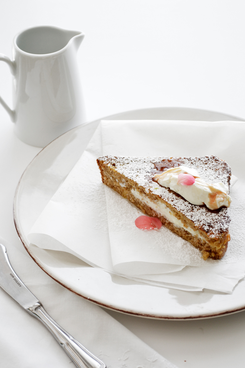 This is a special and very filling version of french toast. I have already uploaded something similar on the blog here, made by Vicky. I tried the combination of sour and sweet using this traditional greek cheese, xynomizithra (sour mizithra cheese), and pomegranate syrup offered to me by Dimitris. You can use any other cheese you like, given that it can have a cream-like texture, like cream cheese, ricotta or katiki cheese (another traditional greek cheese). Another little trick I did in order to prevent the warm cheese from spreading out was to cut a thick slice of bread, almost 2cm thick, and cut a small hole on one side creating a pocket inside and filling it with the cheese. The squarer the slice of bread the better. Of course, you can have your french toast with honey (cheese and honey is always an amazing combination), marmelade or any other syrup you like. For two stuffed french toasts you will need