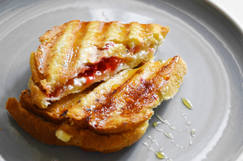This is another of my cheese-fruit combinations. This time I used feta cheese and fresh strawberries. I cut both cheese and strawberries in thin slices to help them melt easily, I added some honey and a thinly chopped mint leave, which I thought of and added in the end (that’s why you don’t see it in the first picture). I used a toaster on low temperature to grill the sandwich and I added some more honey to serve it. The feta cheese melted perfectly, the strawberries with the honey tasted like a warm jam and the mint lifted the flavor of the whole sandwich!