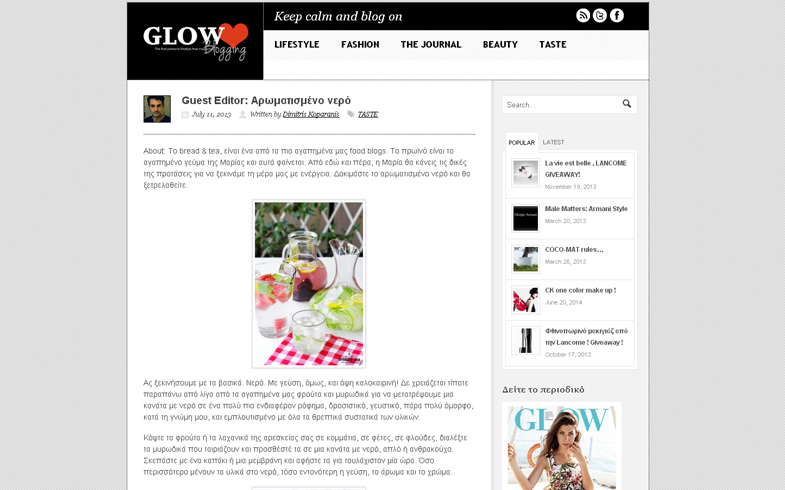 Μπορείτε να διαβάσετε το guest post μου με θέμα “Αρωματισμένο νερό” στο blog του περιοδικού Glow στη στήλη Taste, που επιμελείται ο Δημήτρης Κοπαράνης.