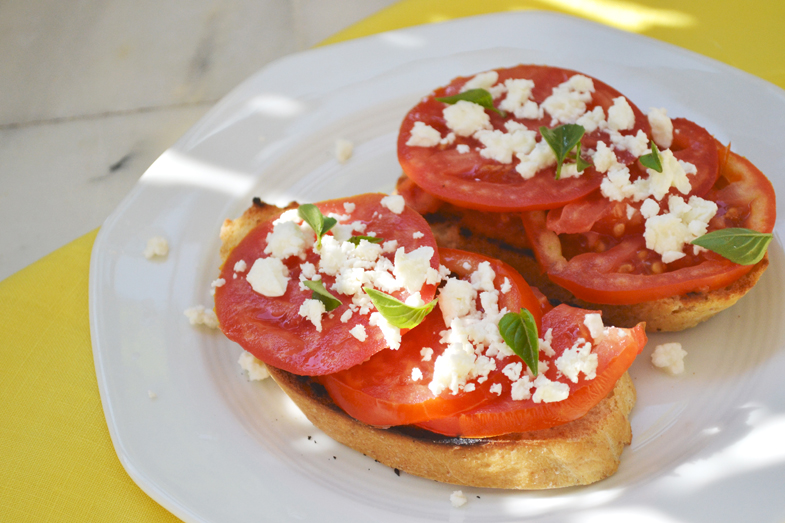 Έχω την τύχη κάθε καλοκαίρι από τον Ιούλιο μέχρι το Σεπτέμβριο να έχω στη διάθεσή μου τις πιο αγνές, ζουμερές και με αυθεντική γεύση ντομάτες από τον κήπο του πατέρα μου, μαζί και με άλλα πολλά ζαρζαβατικά. Θα μπορούσα, λοιπόν, να ανεβάσω τα πιο νόστιμα smoothies, κέικ ή οποιοδήποτε άλλο πιάτο, αλλά το αγαπημένο μου πρωινό το καλοκαίρι είναι μια φέτα ψωμί, φρέσκια ή φρυγανισμένη, με πολλές φέτες ντομάτας, λίγο τυρί φέτα και φυλλαράκια φρέσκου βασιλικού.