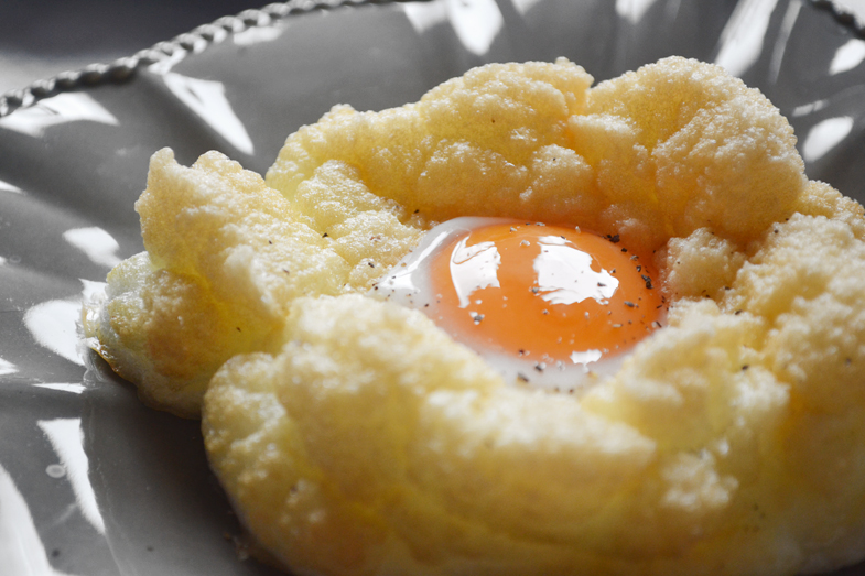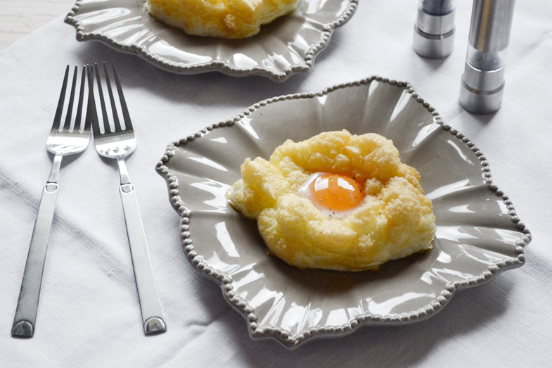 Preheat the oven to 220°C and line a baking sheet with parchment paper. Separate eggs, putting whites in a bowl of an electric mixer and yolks in 2 separate small bowls.  Add the salt to the egg whites and beat them until stiff peaks form. Gently fold in the grated cheese, taking care not to deflate them. Create two mounds of the egg white mixture on the lined baking sheet and use a spoon to create a small well in the center of each. Bake for 3-4 minutes, then add one yolk to each well and continue baking for another 3 minutes until yolks are just set. Serve immediately. Serves two.