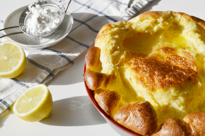 Είναι ένα πολύ εντυπωσιακό πιάτο, αφού εκεί που δεν το περιμένεις ένας απλός χυλός μετατρέπεται σε μια απίστευτα αφράτη ζύμη. Επιπλέον, ο συνδυασμός με λεμόνι και ζάχαρη είναι αναπάντεχος και σχεδόν εθιστικός. Σας προτείνω να το δοκιμάσετε οπωσδήποτε! Θα χρειαστείτε ένα αντικολλητικό σκεύος διαμέτρου 22-23 εκατοστών κατάλληλο για φούρνο. Μπορεί να είναι ένα τηγάνι, ταψάκι ή κεραμικό σκεύος, όπως αυτό που χρησιμοποίησα και φαίνεται στις φωτογραφίες. Τα υλικά για 3-4 μερίδες (ή δύο, αν είστε σπίτι μου) είναι