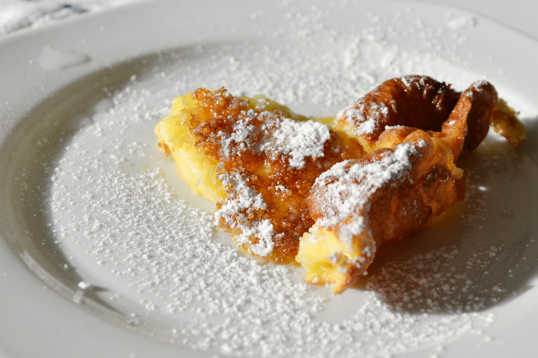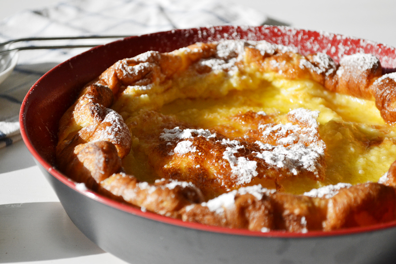 Προθερμάνετε το φούρνο στους 210 βαθμούς. Λιώστε το βούτυρο μέχρι να κάψει. Αν χρησιμοποιήσετε τηγάνι για φούρνο, λιώστε το κατευθείαν εκεί. Αν όχι, λιώστε το σε ένα μπρίκι. Μέχρι να λιώσει το βούτυρο, χτυπήστε με ένα σύρμα όλα τα υπόλοιπα υλικά σε ένα μπολ. Ρίξτε στο σκεύος σας το καυτό βούτυρο και μετά το χυλό. Ψήστε για 12-13 λεπτά μέχρι να φουσκώσει και να πάρει χρώμα. Σερβίρετε αμέσως, γιατί αρχίζει και ξεφουσκώνει με το που βγαίνει από το φούρνο.