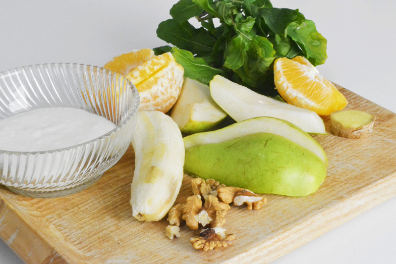 Put all ingredients in your blender and blend for a couple of minutes. If your fruit is at room temperature, you can add 2-3 ice cubes to cool your smoothie. Instead of walnuts, feel free to use any other nuts, such as almonds or pine nuts. Definitely use the ginger! It gives this smoothie’s distinctive spicy flavor.