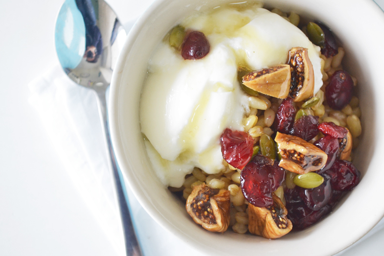 I take a break from oats for another cereal for my breakfast. Wheat is a rather neglected cereal, maybe because of gluten, but if you don’t suffer of some kind of intolerance, it is a very healthy and filling choice, perfect for breakfast. Today I tried it with yogurt, dried fig and cranberries, sunflower and pumpkin seeds.