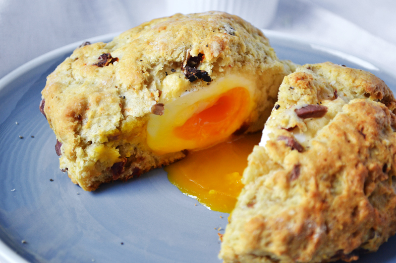 Buttermilk biscuit with green olives, sundried tomatoes and a surprise egg!