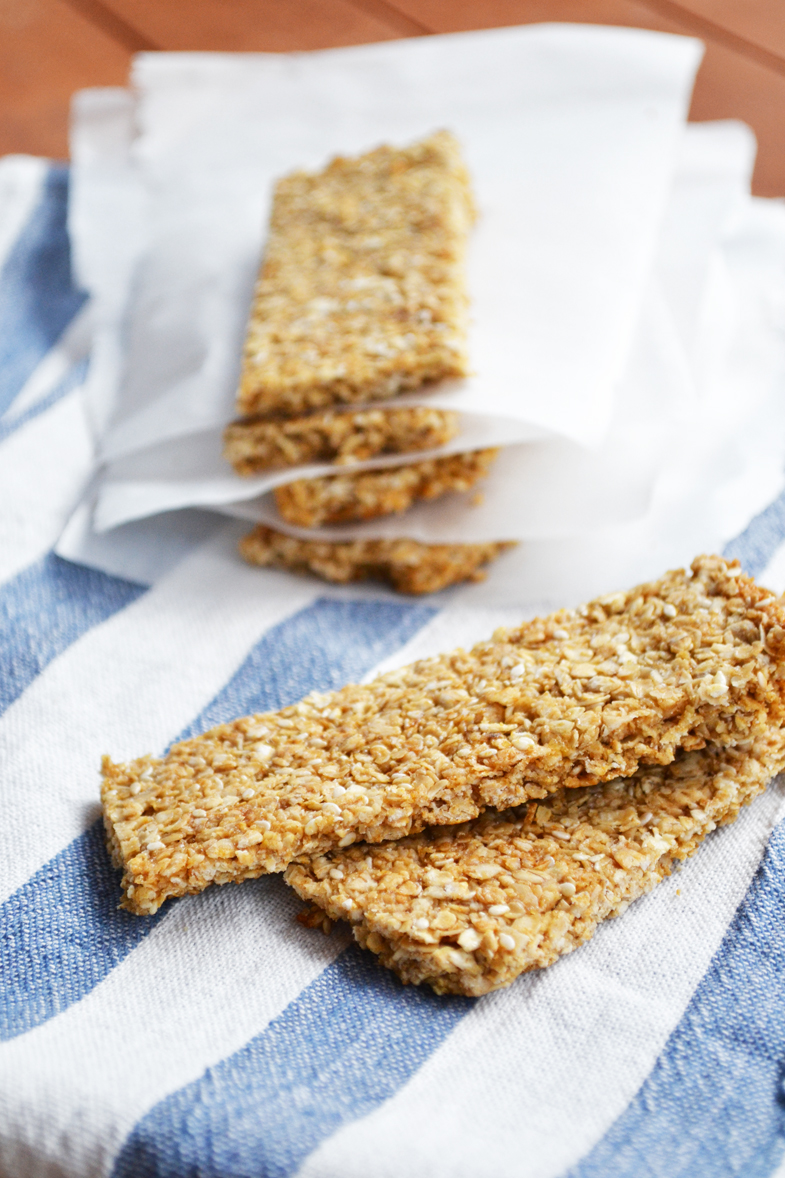 Preheat oven at 170 degrees. In a bowl mix the oats, sesamy seeds, oat flour, baking soda and salt. Heat the honey until liquid and add it with the olive oil to the dry ingredients. Mix well. Use a small square or rectangular baking dish (mine was 20×20 cm) and line it with parchment paper. Transfer the mix evenly in the dish and press it really hard to get it as thin as possible. Bake for 18-20 minutes until lightly golden at the edges and leave it for a couple of minutes to cool before cutting it to pieces (the cutting is easier when it is still warm). Let the bars cool completely before storing them in an airtight container for up to a week. Try them and also make your own version with your favorite nuts and seeds!