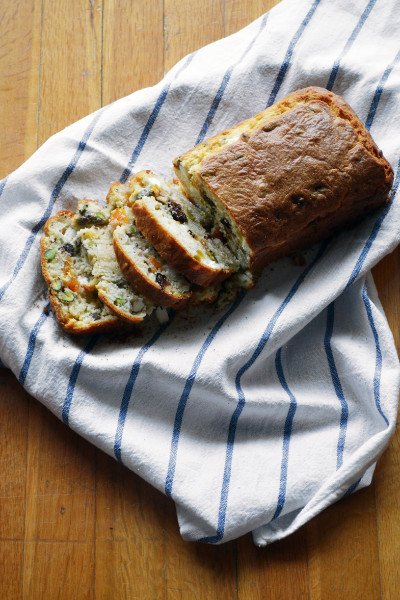 Preheat oven at 180 degrees and line a loaf tin with baking paper. The baking paper is necessary, since this cake does not unmold easily even from a non-stick tin. Cut two pieces of baking paper, one wide and one narrower to cover the tin. In a bowl mix together the flour, baking powder, feta cheese, pistachios and dried fruit. In another bowl, whisk the eggs until fluffy and gradually whisk in the oil, milk and yoghurt. Season with the salt and freshly ground pepper.Add the flour mixture into the egg mixture. Mix preferably with a fork and try not to overmix as this will result to a tough batter. Pour the batter into the prepared tin and bake for approximately 40 minutes until a skewer inserted in the centre of the cake comes out clean. Leave to cool in the tin before unmolding and cutting it. Of course, this is a recipe that can be easily adapted to whatever nuts or dried fruit you have or like. Enjoy!