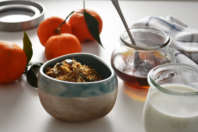 My latest obsession is this granola baked with sesamy oil and spiced with cardamon and cinnamon. Its aroma and taste differs it from any other granola I have ever baked and it makes it perfect for these cold winter mornings! If you don’t have sesamy oil, you can replace it with tahini or a mild olive oil. The ingredients are