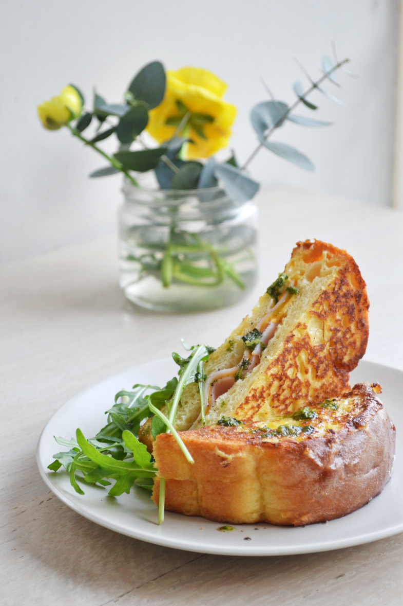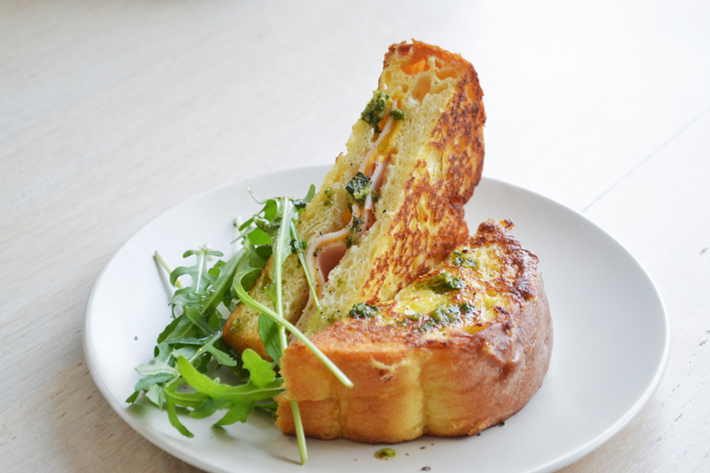 I know that we usually use stale bread for french toast, but make sure you use a fresh loaf for these. They will be the most fluffy french toast you ‘ve ever had. Whisk the eggs, milk, sugar and salt in a deep dish. Take each slice of bread and using a sharp knife make a cut on one side until you reach its half. Continue cutting in order to create a pocket inside the whole slice. Fill the pocket with the turkey and cheese and dip both sides of the bread in the batter just like you normally do with french toast. Cook in a hot pan until golden brown on both sides. Serve with your favorite greens, spinach, arugula, basil pesto or fresh onions. Enjoy!