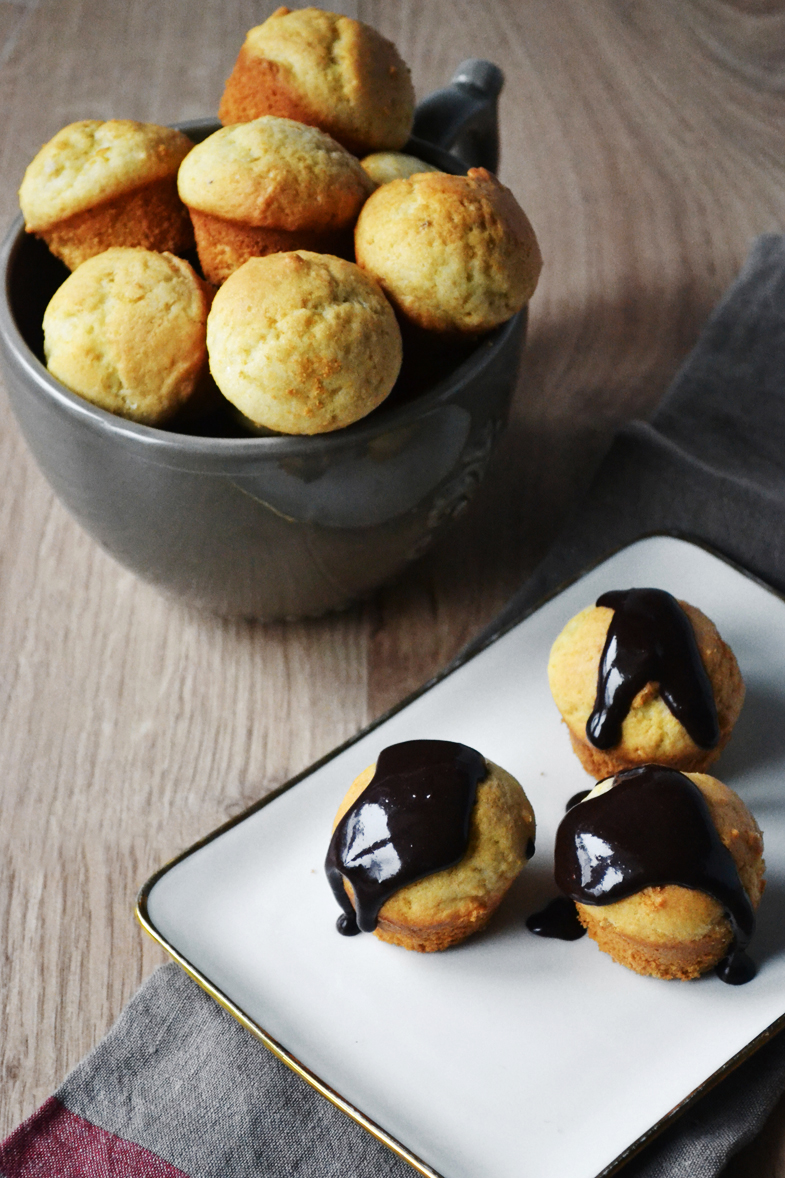 They are fluffy mini muffins with nutmeg and an easy chocolate glaze and they come in bite size to accompany your morning coffee this weekend. You need the special pan for 24 mini muffins, but even if you don’t have it, you can still use your ordinary 12-muffin pan for twelve normal ones. The ingredients are
