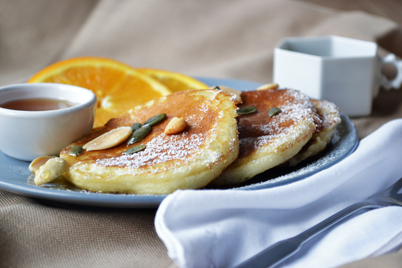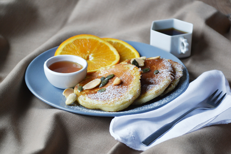This was my weekend breakfast, fluffy and hot cardamon-scented pancakes. I also prepared an easy syrup with honey and orange juice and served them with nuts, orange slices and hot coffee. What’s really cool about this recipe (it comes from here) is that the batter is not that sweet, so you can serve your pancakes sweet, just like me, or savory with cheese and turkey or ham, to satisfy all preferences. The ingredients for almost 18 pancakes are
