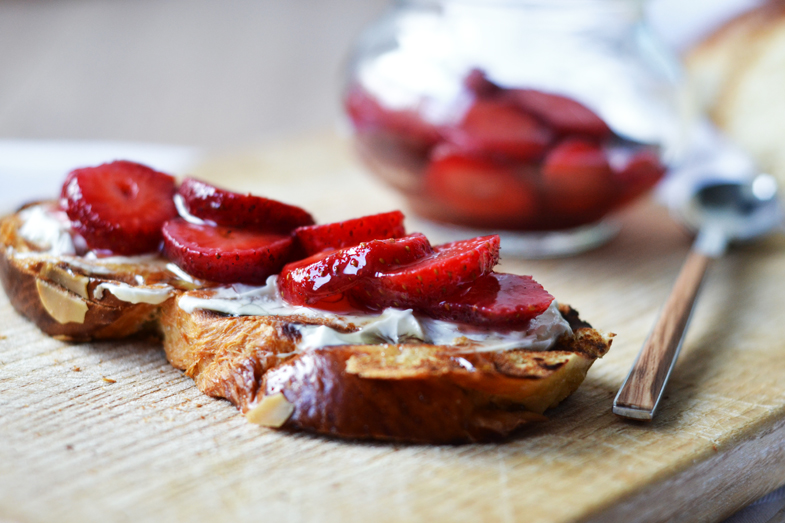 Αυτό το πρωινό προέκυψε μόλις συνδύασα το τσουρέκι, σπιτικό τσουρέκι λίγων ημερών που είχε αρχίσει να στεγνώνει, με τις αγαπημένες μου φράουλες. Για την ακρίβεια, αυτές οι φράουλες είναι η δική μου γλυκιά εκδοχή τους αντί για το γνωστό φράουλες με ζάχαρη. Είναι μαριναρισμένες σε χυμό πορτοκαλιού με μέλι και φυσική βανίλια και η γεύση τους είναι γλυκιά και φρέσκια χωρίς την προσθήκη ζάχαρης. Το δοκίμασα εξαρχής σαν επιδόρπιο ή γλυκό σνακ και το επόμενο βήμα ήταν να τις χρησιμοποιήσω στο πρωινό μου. Για τις φράουλες θα χρειαστείτε
