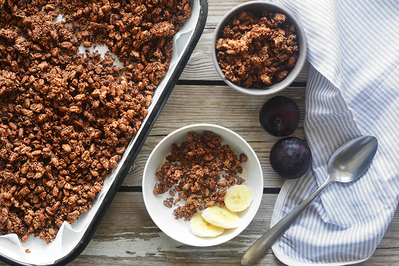 All my cereals with cocoa (like this granola also), even when I use more honey, do not have a very sweet taste, which means kids might find them quite bitter (even if that’s perfect for me). For a more kid-friendly version, a fore coming post would be vanilla, cinnamon or banana cereals.
