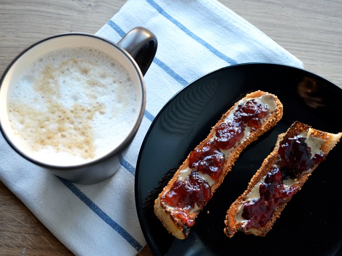 Το χθεσινό κουλούρι στη φρυγανιέρα, ταχίνι, μαρμελάδα και ένας ζεστός cappuccino! Toasted bagel with tahini and marmalade Yesterday’s bagel in the toaster, tahini, marmalade and a hot cappuccino!