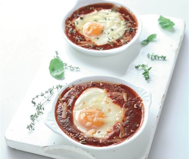 αυγά στο φούρνο με σάλτσα ντομάτας και γραβιέρα
