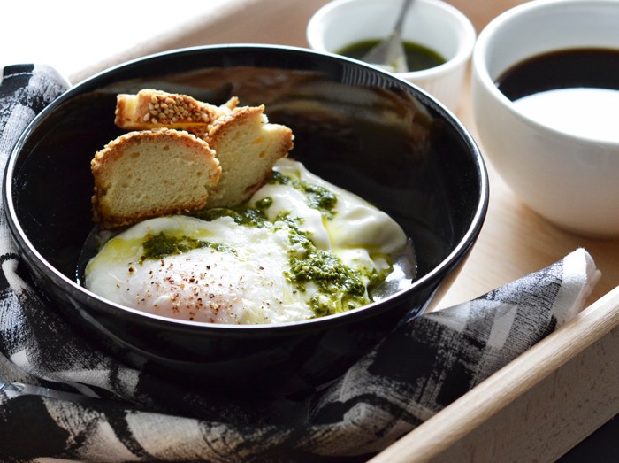 αυγό ποσέ με γιαούρτι, πέστο βασιλικού και κουλούρι θεσσαλονίκης