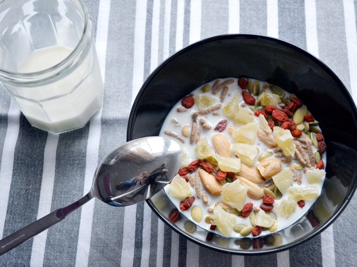 γάλα με δημητριακά, ξηρούς καρπούς και αποξηραμένα φρούτα