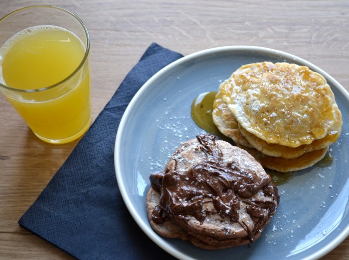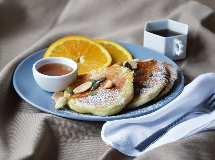 pancakes με ελαιόλαδο, κάρδαμο και σως μέλι-πορτοκάλι