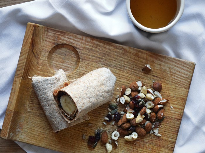 τορτίγια ολικής με αμυγδαλοβούτυρο, μπανάνα και mix ξηρών καρπών