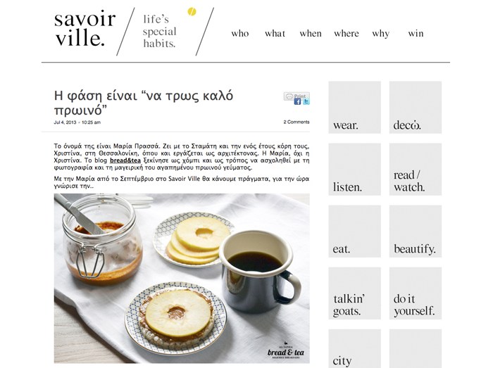Το breadandtea είχε την πρώτη του αναφορά σε έντυπο περιοδικό, στο τεύχος Μαρτίου του περιοδικού Close Up στη στήλη ‘Nice things to do’ της Βίκυς Πούλιου! Ευχαριστώ πολύ τη Βίκυ, της οποίας τις φρέσκες και πάντα μέσα στη μόδα συμβουλές και προτάσεις μπορείτε να βρείτε σ’αυτή […]